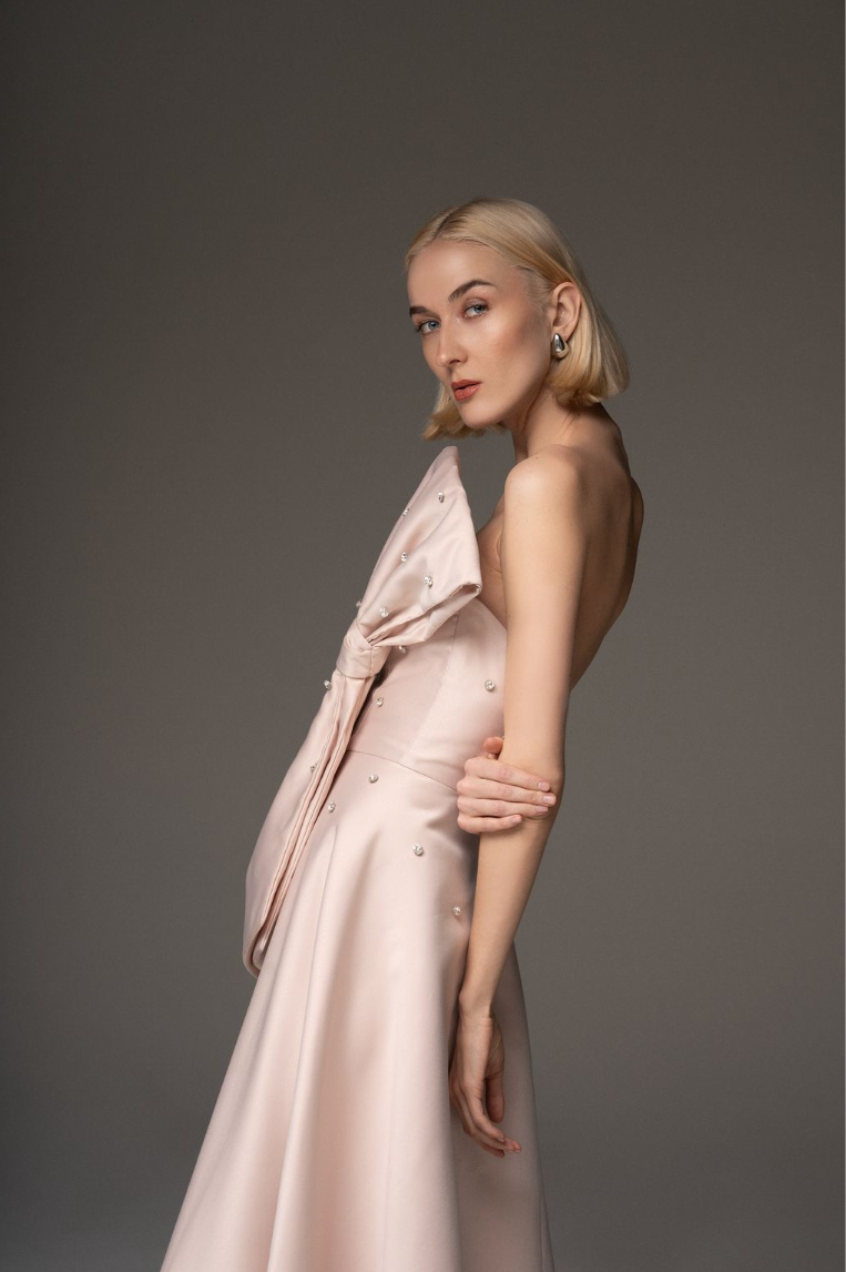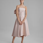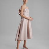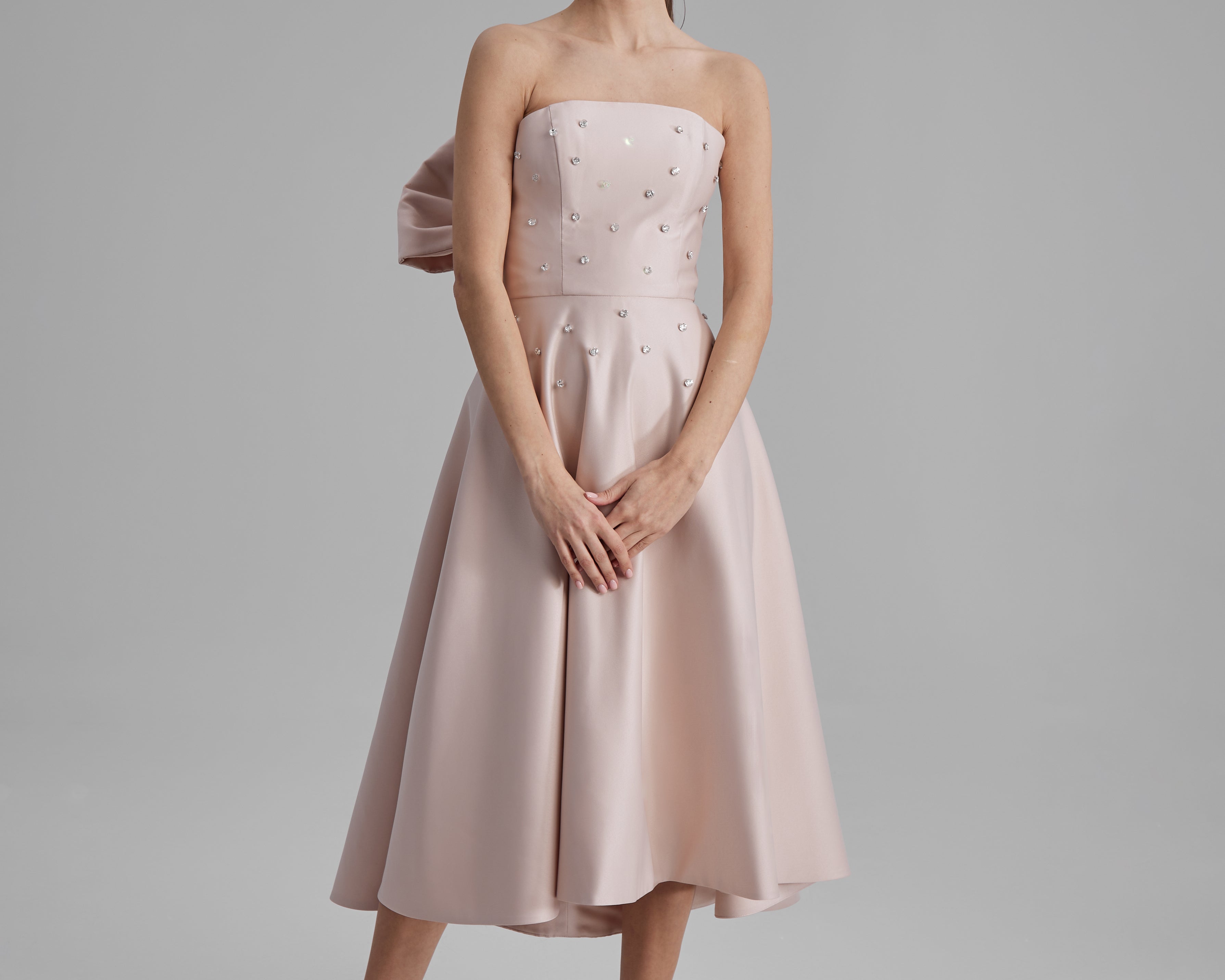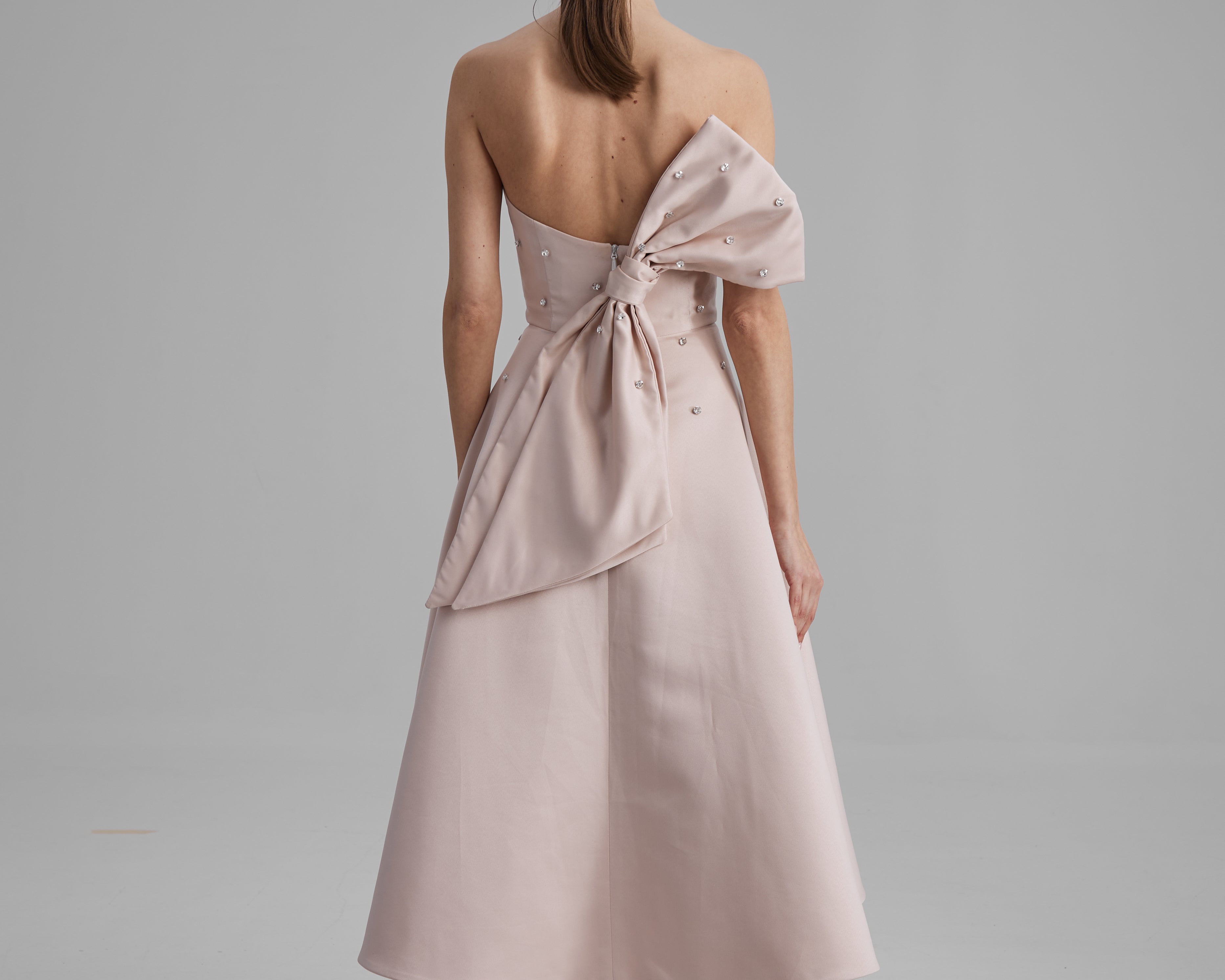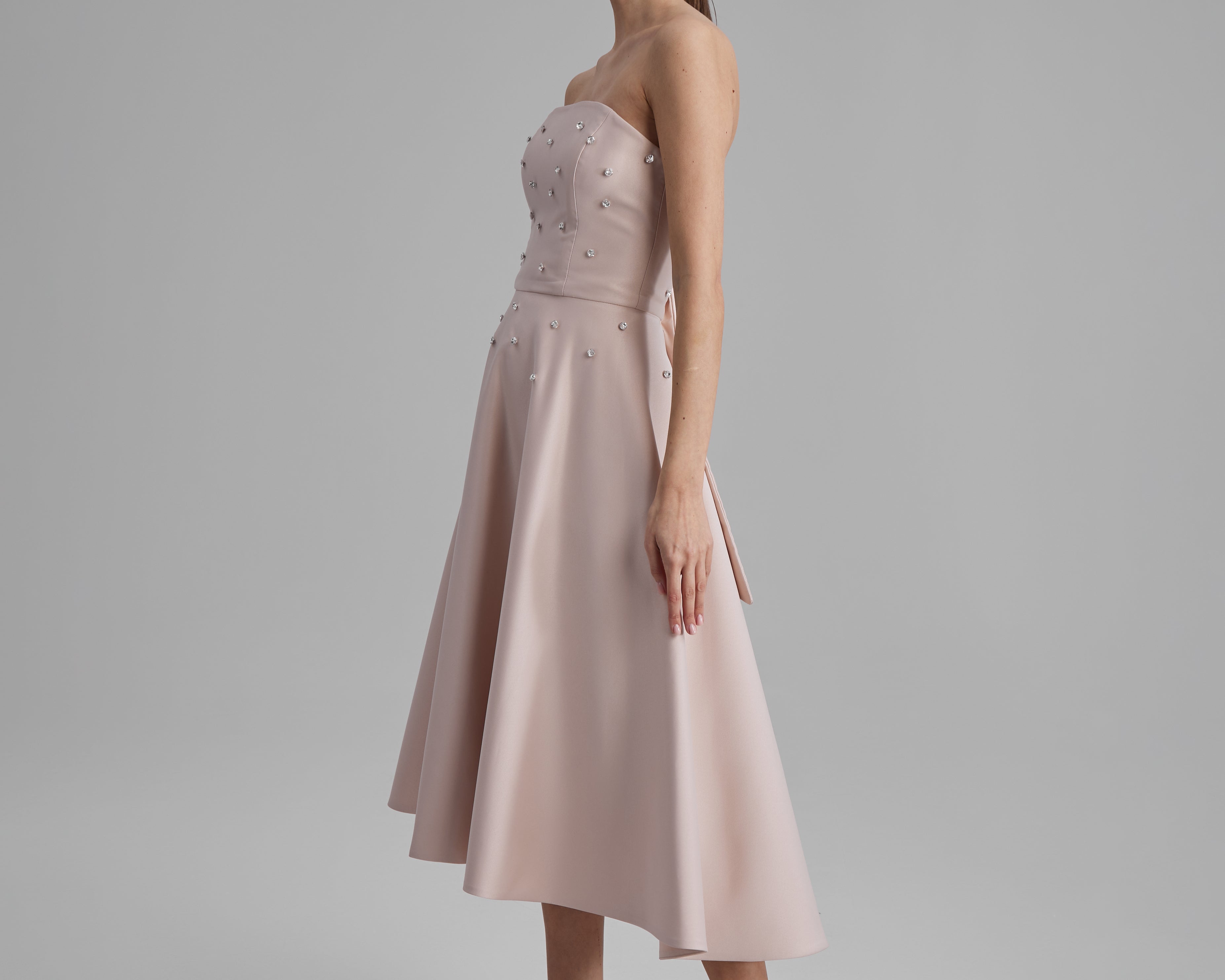 MIA DRESS WITH DIAMONDS + SIDE BOW | strapless midi in nude