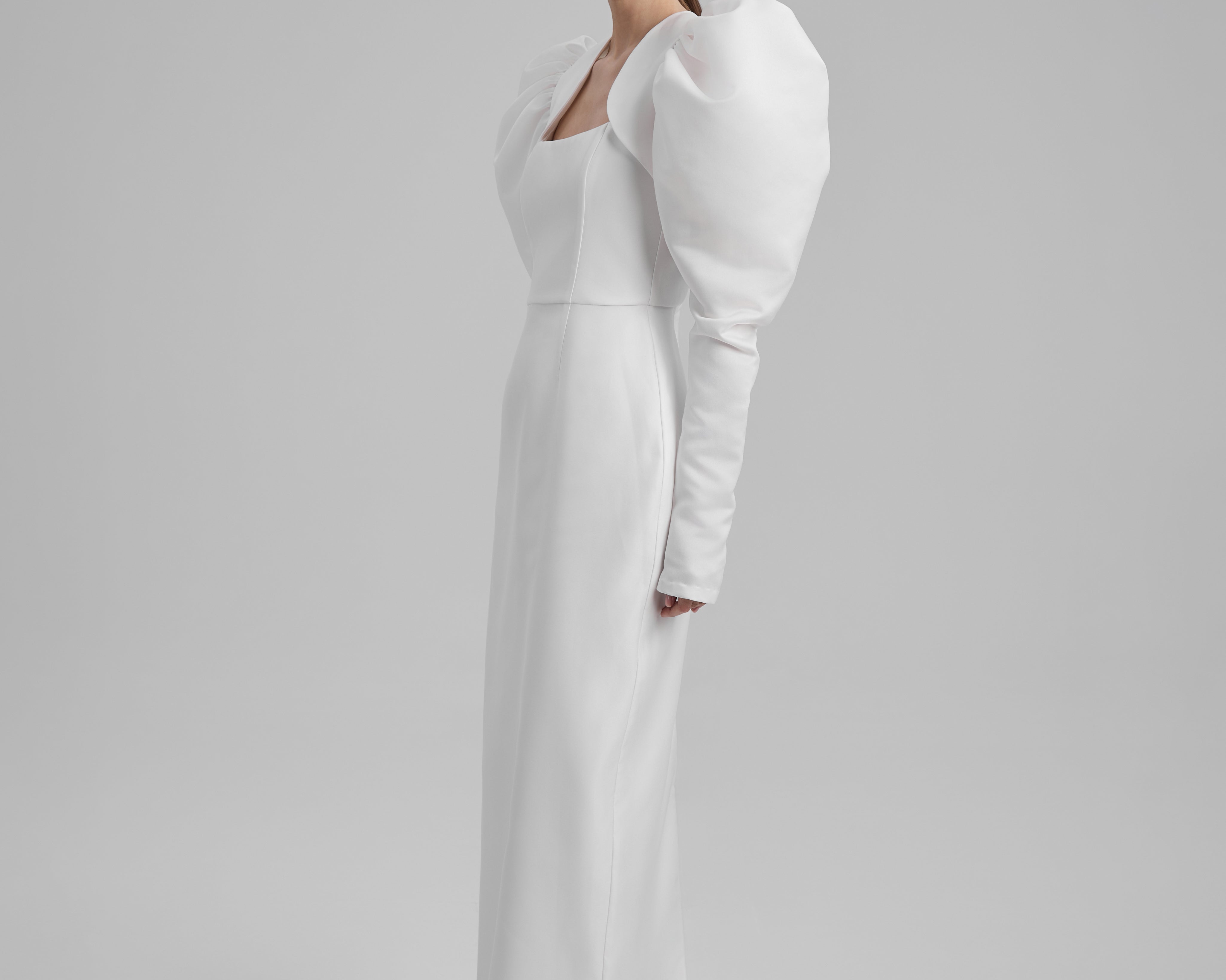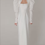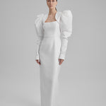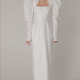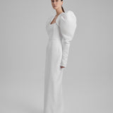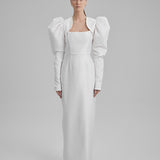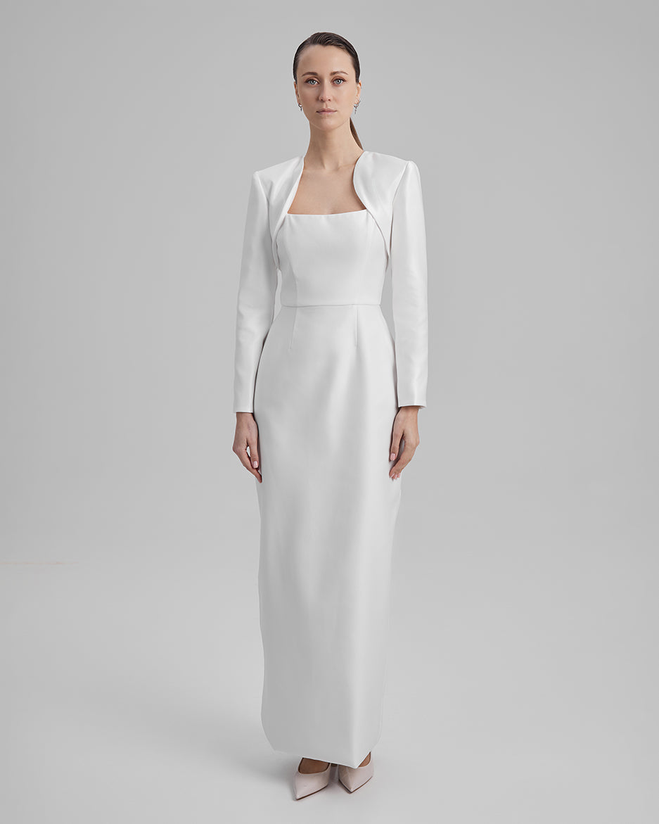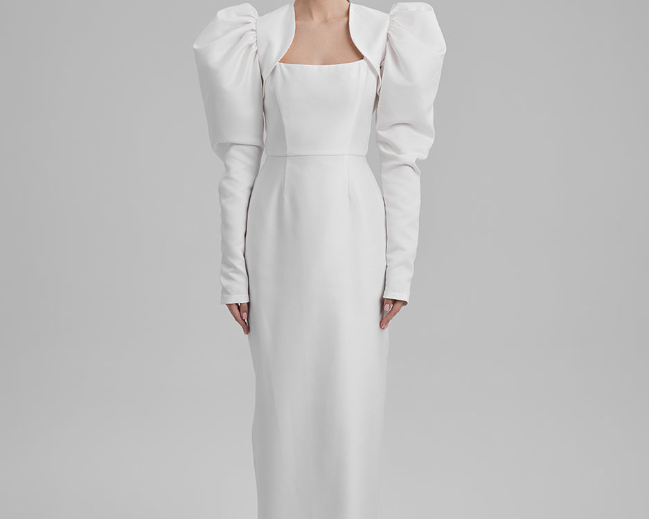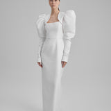 IDA DRESS + PUFFED SLEEVE BOLERO | square neckline pencil maxi in white